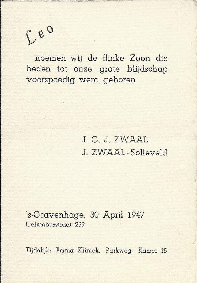 Op 30 april 1947 werd ik in Den Haag in de Emma Kliniek