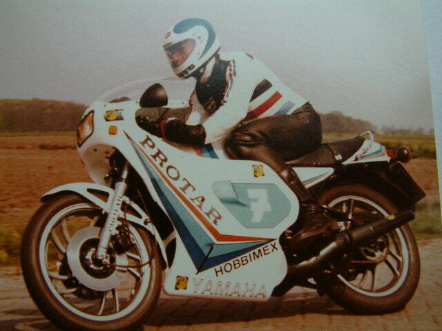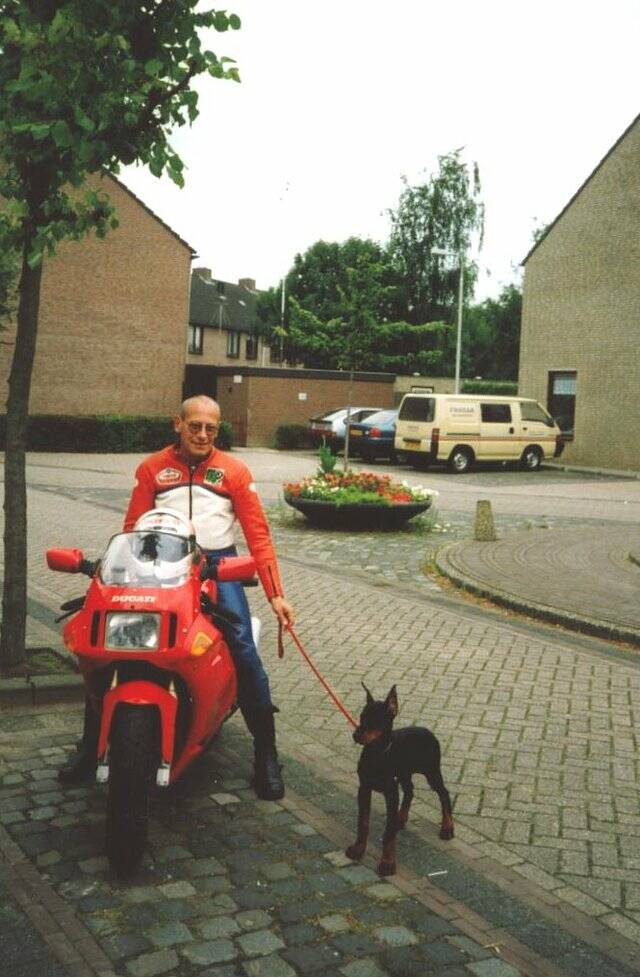 (Op de linkerfoto heb ik nog mijn "Jack Middelburg replica"-overall van de Yamaha RD350LC periode aan en houd ik onze jonge dobermann "DESMO" aan de lijn)